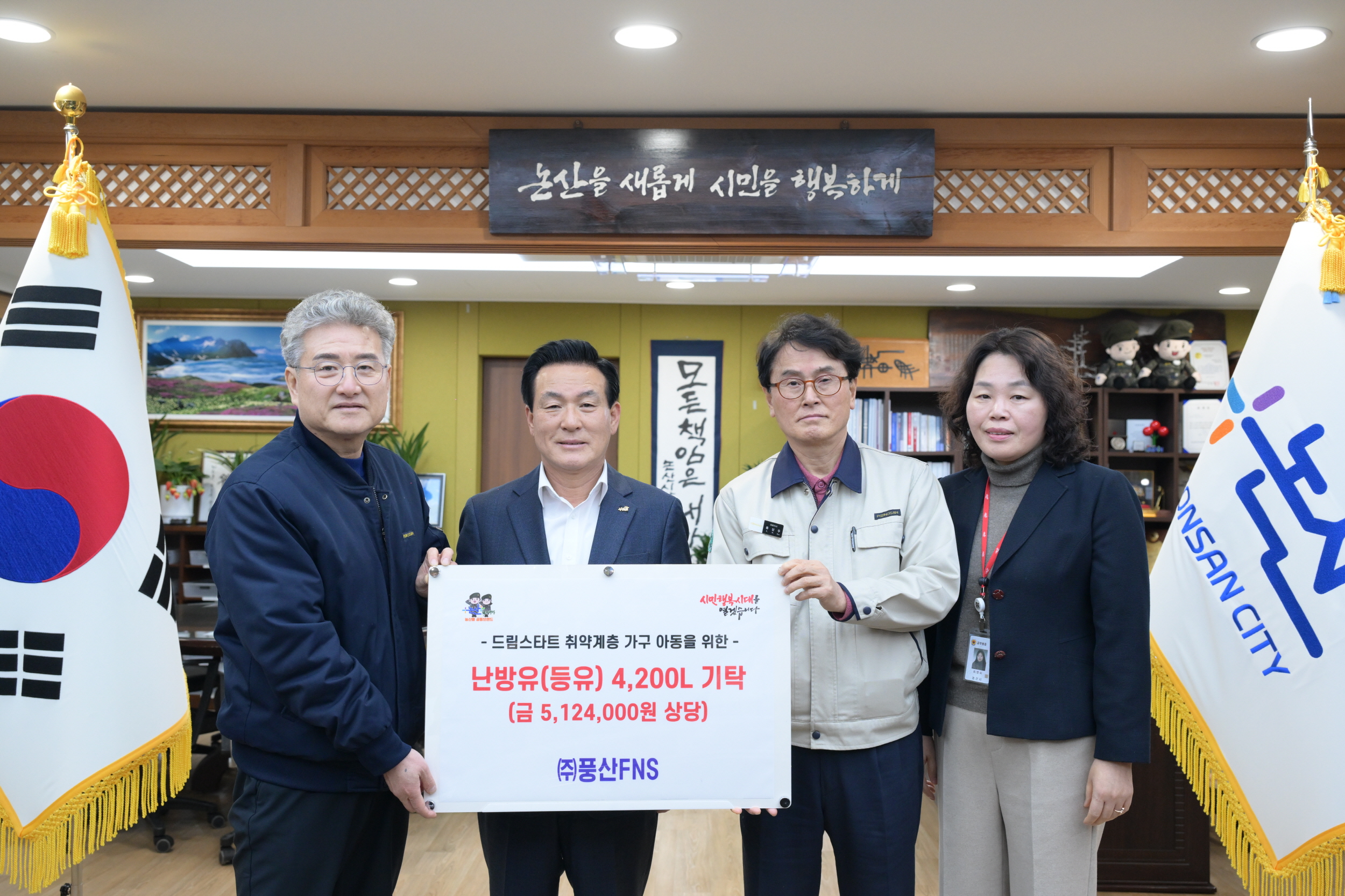 [세종타임즈] 논산시는 15일 국방산업 전문기업 ㈜풍산FNS가 저소득 아동들을 위해 약 500만 원 상당의 등유 4200리터를 기탁했다고 밝혔다.