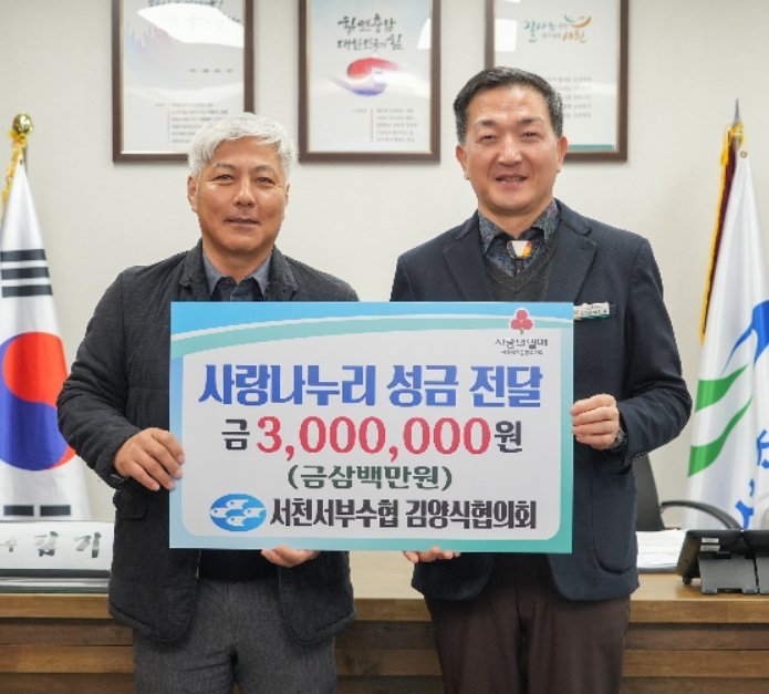 [세종타임즈] 서천군은 서천서부수협 김양식협의회가 지난 16일 연말연시를 맞아 어려운 이웃을 돕기 위한 사랑나누기 성금을 기부했다.