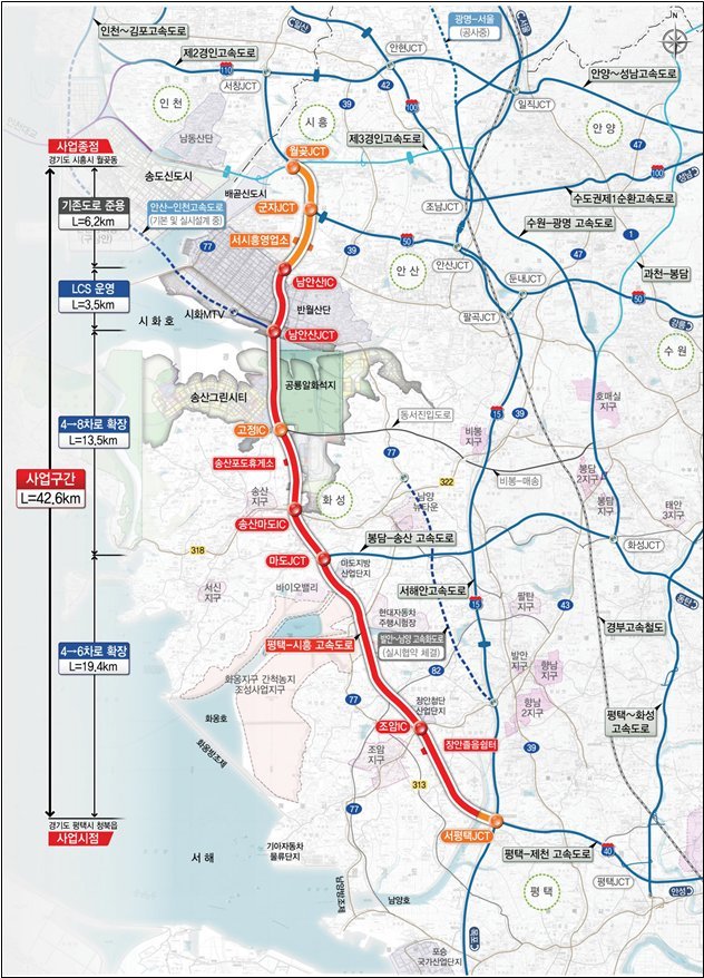 ’13년부터 운영되고 있는 평택-시흥 민자고속도로의 확장*이 완료되면, 수도권 서남부 지역의 교통정체가 개선되고, 인근지역 개발로 인한 교통수요 증가와 인천항, 평택당진항의 산업물동량 변화에 선제적인 대응이 가능할 것으로 기대된다.