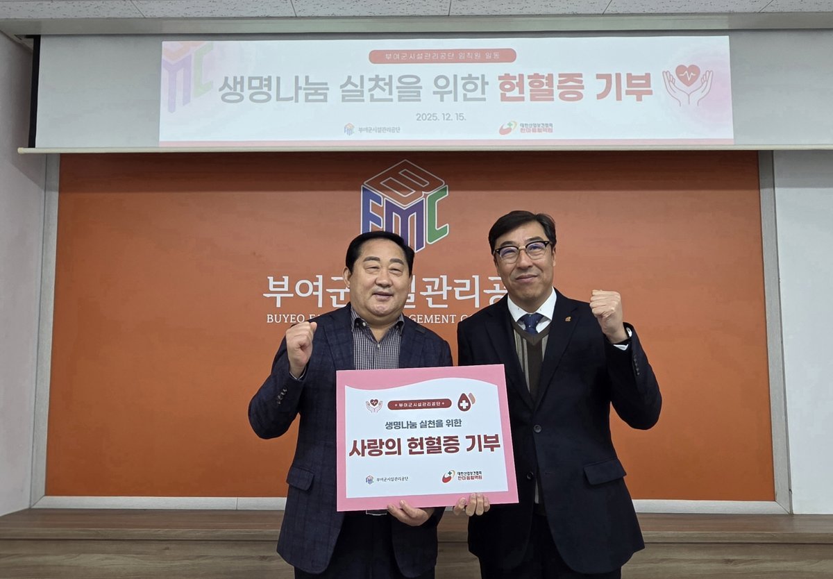 [세종타임즈] 부여군시설관리공단은 임직원들이 자발적으로 모은 헌혈증 84매를 대한산업보건협회 한마음혈액원에 기부하며 지역사회 생명 나눔 활동에 동참했다고 18일 밝혔다.