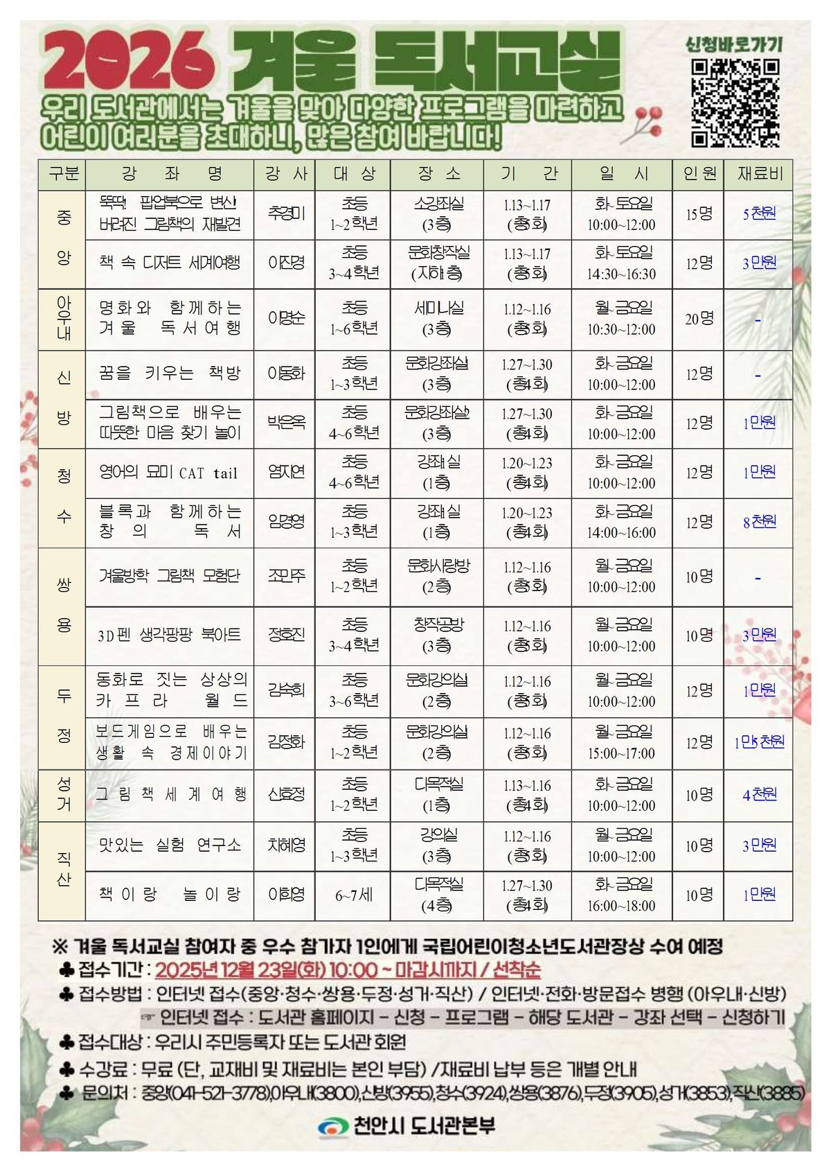 겨울 독서교실은 천안시 8개 공공도서관에서 운영되며, 독서활동과 함께 요리체험, 창작활동 등 다양한 프로그램이 진행될 예정이다.