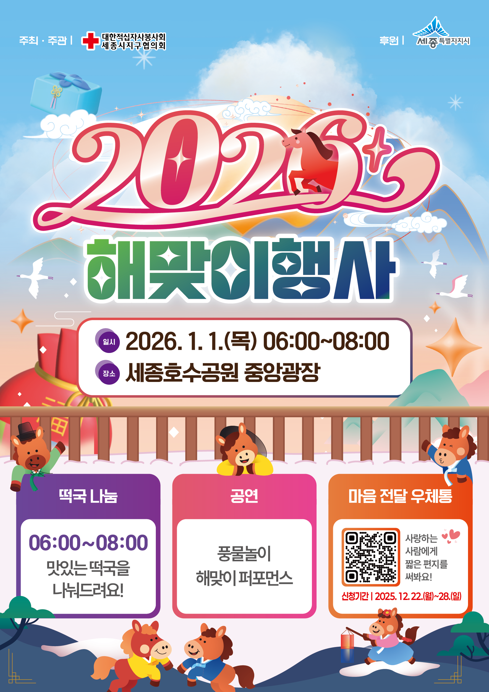 이번 해맞이 행사는 대한적십자사봉사회 세종시지구협의회 주관으로 1월 1일 오전 6시부터 진행되며, 시민들이 새해 첫 일출을 감상하고 떡국을 나누며 희망찬 새해를 맞이할 수 있도록 마련됐다.