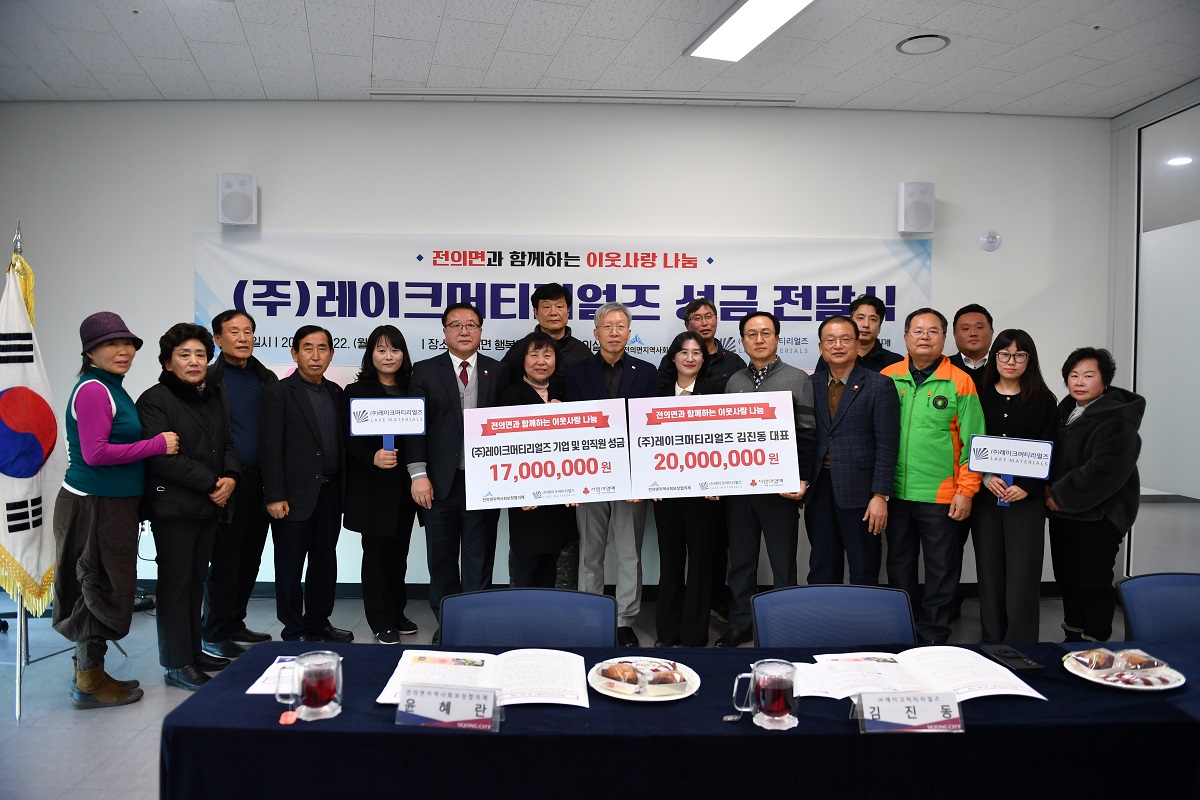 [세종타임즈] 세종특별자치시 전의면지역사회보장협의체가 22일 전의면 행복누림터에서 ㈜레이크머티리얼즈로부터 성금 3,700만 원을 전달받았다.
