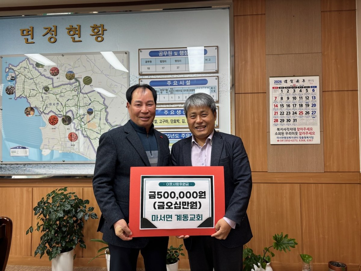 [세종타임즈] 서천군 마서면 계동교회가 지난 19일 마서사랑후원회에 후원금 50만원을 기탁하며 지역사회에 따뜻한 나눔을 실천했다.