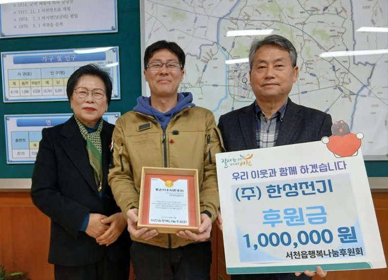 [세종타임즈] ㈜한성전기는 지난 19일 서천읍행복나눔후원회에 취약계층 지원을 위한 후원금 100만원을 기탁하며 ‘좋은이웃사촌 186호’로 선정됐다.