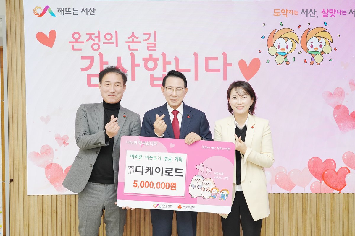 [세종타임즈] 충남 서산시는 24일 ㈜디케이로드가 관내 어려운 이웃을 돕기 위한 성금 500만 원을 기탁했다고 밝혔다.
