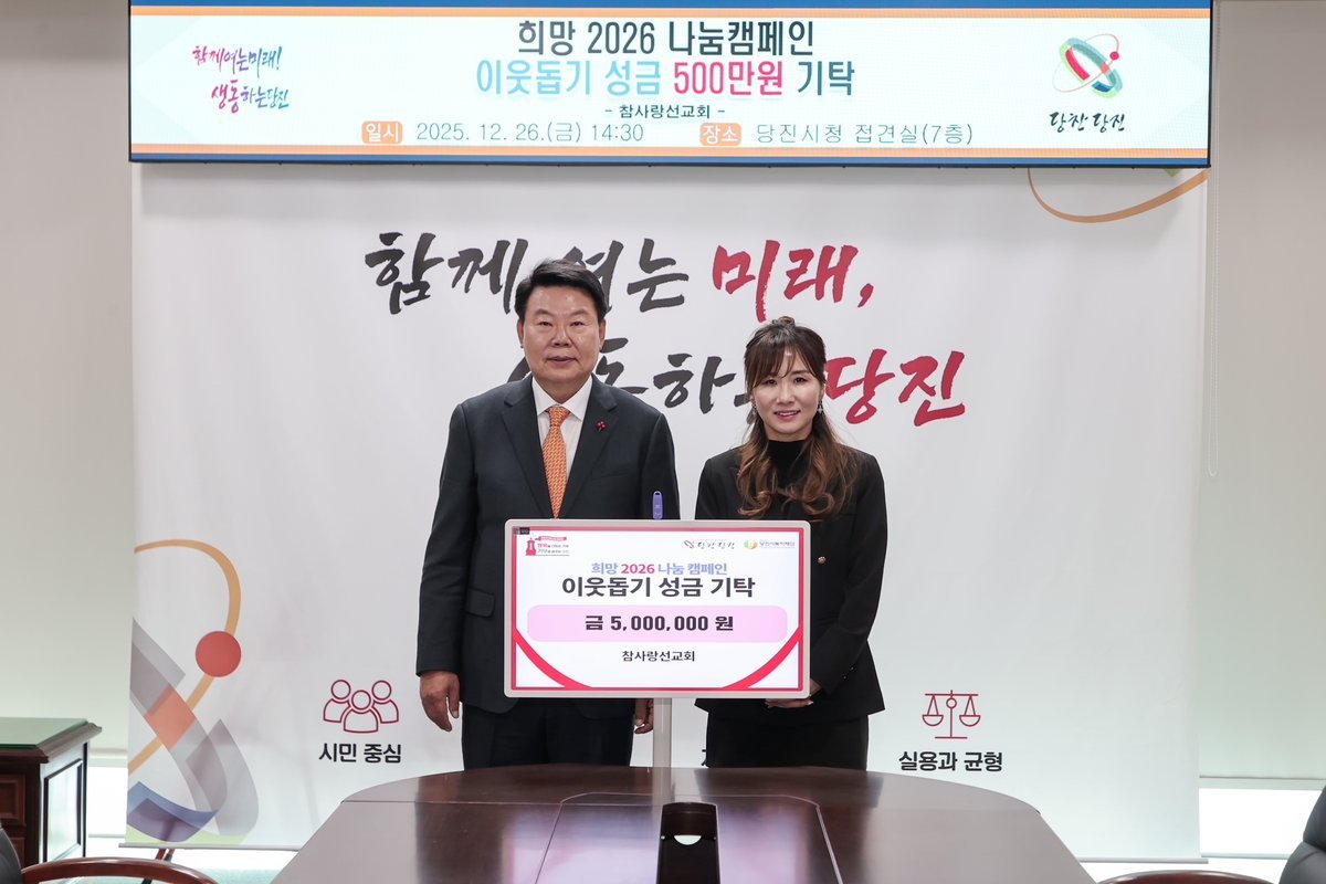 오성환 당진시장은 “오랜 시간 변함없이 나눔을 실천해 오신 참사랑선교회의 따뜻한 마음에 깊이 감사드린다”며, “기탁해 주신 성금은 꼭 필요한 이웃들에게 소중히 전달해 지역사회에 희망의 씨앗이 되도록 하겠다”고 밝혔다.