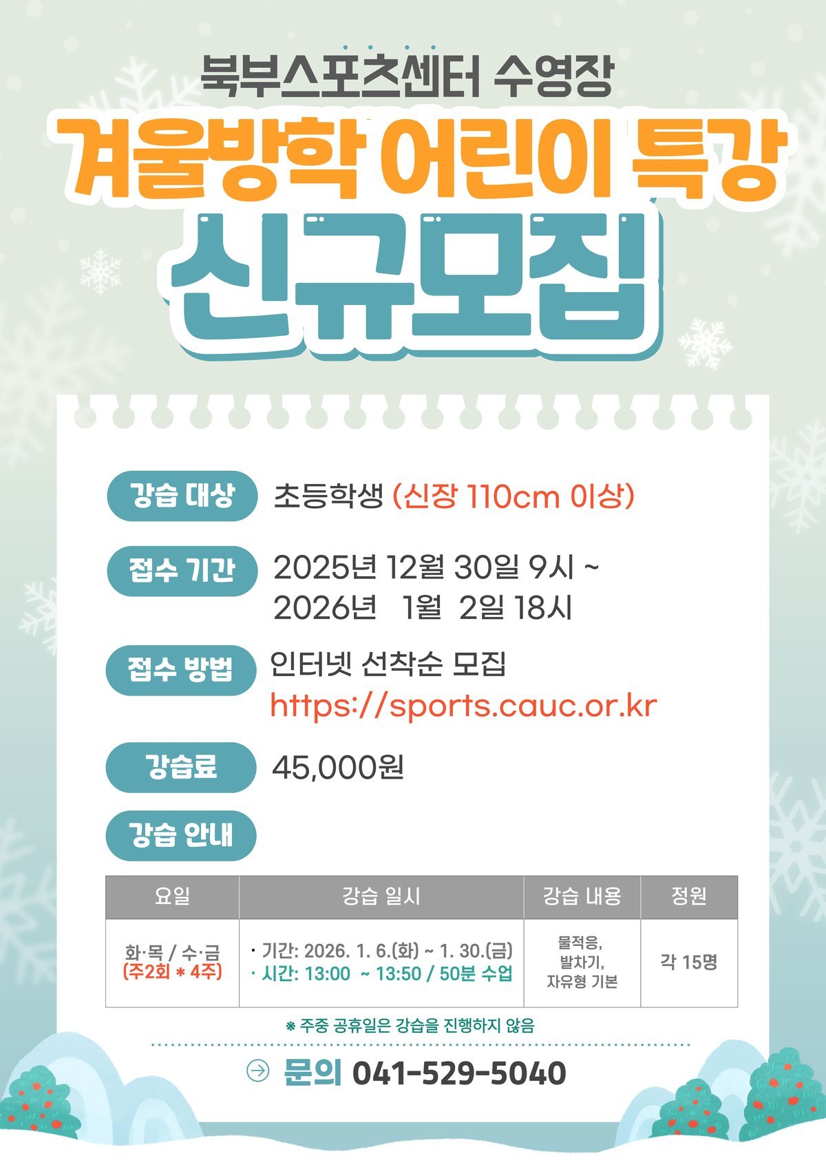 접수는 오는 30일 오전 9시부터 내년 1월 2일 오후 6시까지 북부스포츠센터 누리집에서 선착순으로 진행되며, 강습료는 4만 5,000원이다.