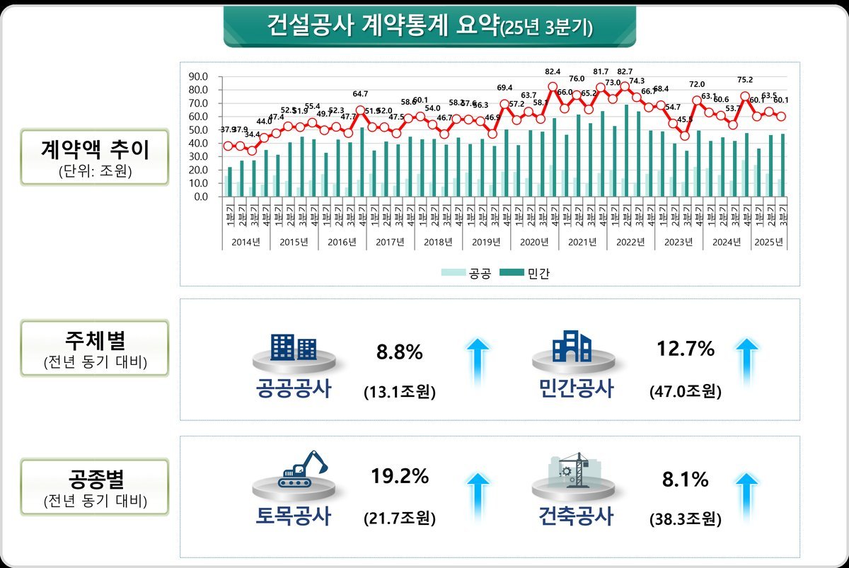 [세종타임즈] 국토교통부는 ’25년 3분기 건설공사 계약액이 전년 동기 대비 11.9% 증가한 60.1조 원을 기록하였다고 밝혔다.