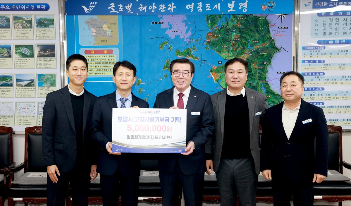 이날 기탁식에는 김지환 정동회계법인 대표이사를 비롯해 김영권 이사, 배진현 이사 등 임직원들이 참석해 보령시에 고향사랑기부금 500만 원을 전달했다.