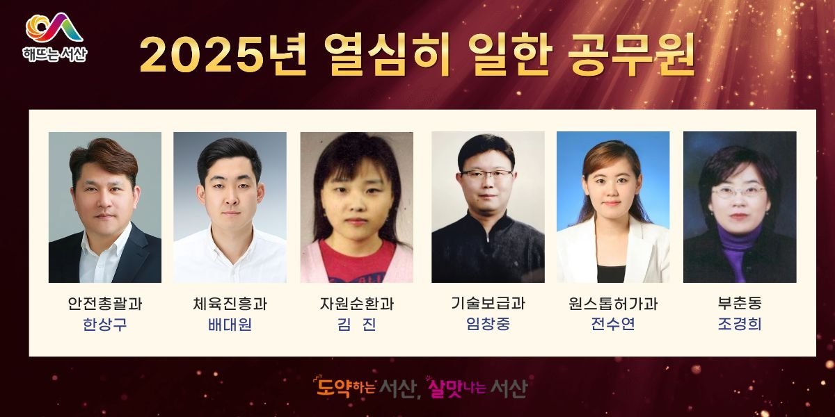 [세종타임즈] 충남 서산시는 올해 시정 발전과 시민 삶의 질 향상을 위해 노력한 공무원 6명을 ‘열심히 일한 공무원’으로 선정했다고 밝혔다.
