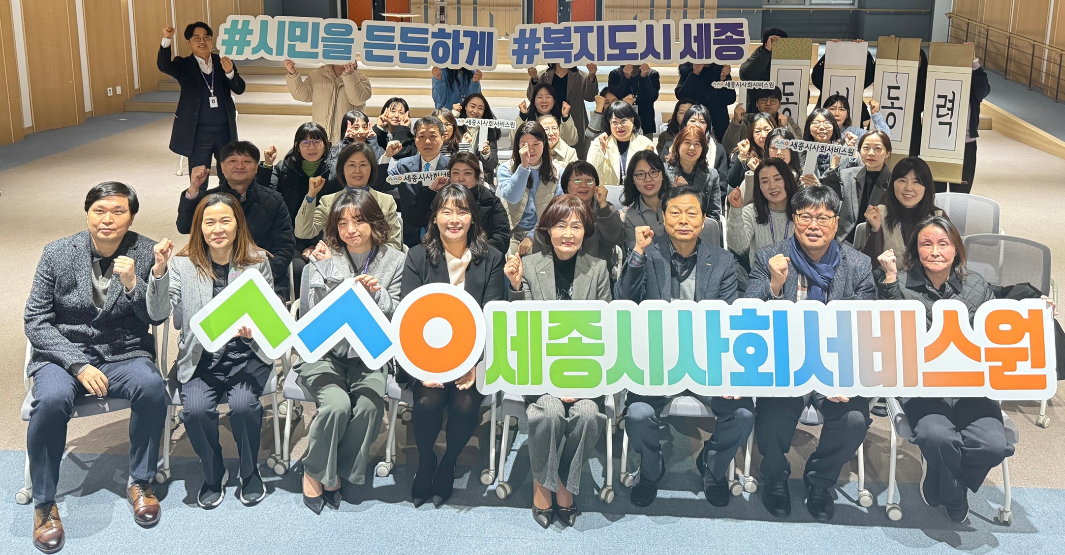 이날 시무식에서는 임직원 전체의 참여로 선정된 신년 화두 ‘동심동력(同心同力)’을 선포하는 족자 퍼포먼스가 펼쳐져 눈길을 끌었다. ‘동심동력’은 마음을 함께 모아 힘을 더한다는 뜻으로, 세종시사회서비스원 임직원 모두가 한마음 한뜻으로 시민이 체감하는 사회서비스 혁신을 함께 이루겠다는 의지를 담았다.