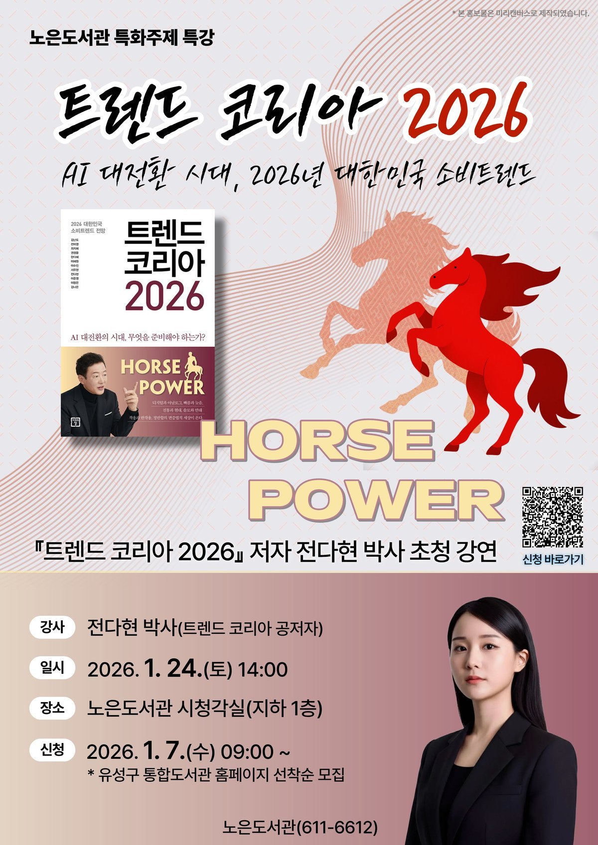 [세종타임즈] 대전 유성구는 오는 24일 노은도서관에서 ‘트렌드 코리아 2026’의 공저자인 전다현 박사 초청 특강을 개최한다.