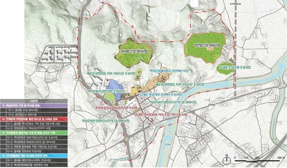 이를 구체화하여 △읍내동산성 및 성안말산성의 수목정비와 탐방로 정비 △읍내동 지역 거리 조성 기반구축 △역사정원 가꾸기 및 역사놀이터 조성 △역사문화권 방문자 센터 및 복합커뮤니센터 조성 △게스트 하우스와 마을도서관 조성 △보행환경 개선 △다양한 역사문화권 교육프로그램 운영 등으로 실행계획을 수립했다.
