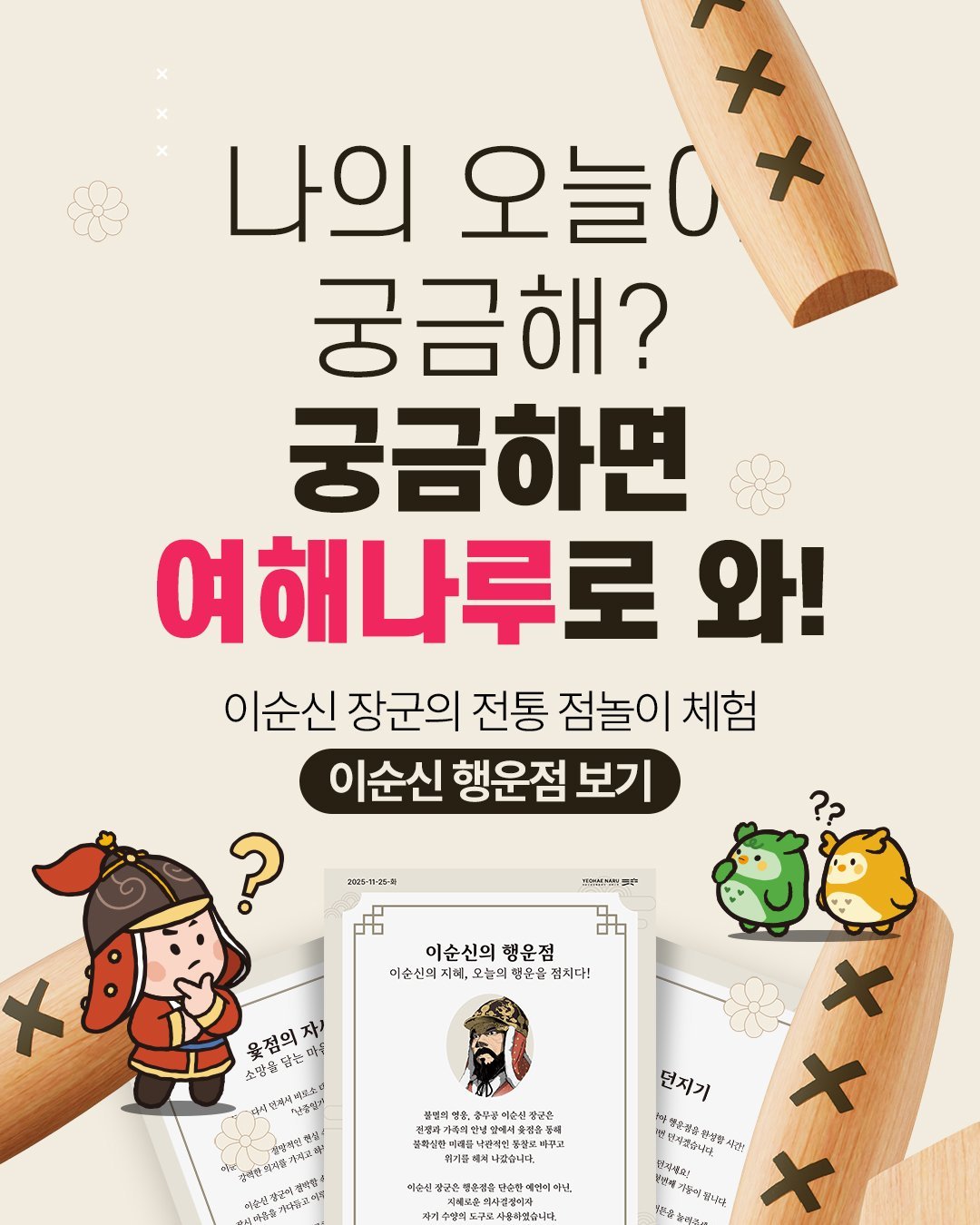 ‘이순신 행운점’은 이순신 장군이 전쟁의 승리와 가족의 안녕을 기원하며 간절한 마음을 담아 점을 보았던 ‘척자점’에서 착안한 체험형 콘텐츠다.