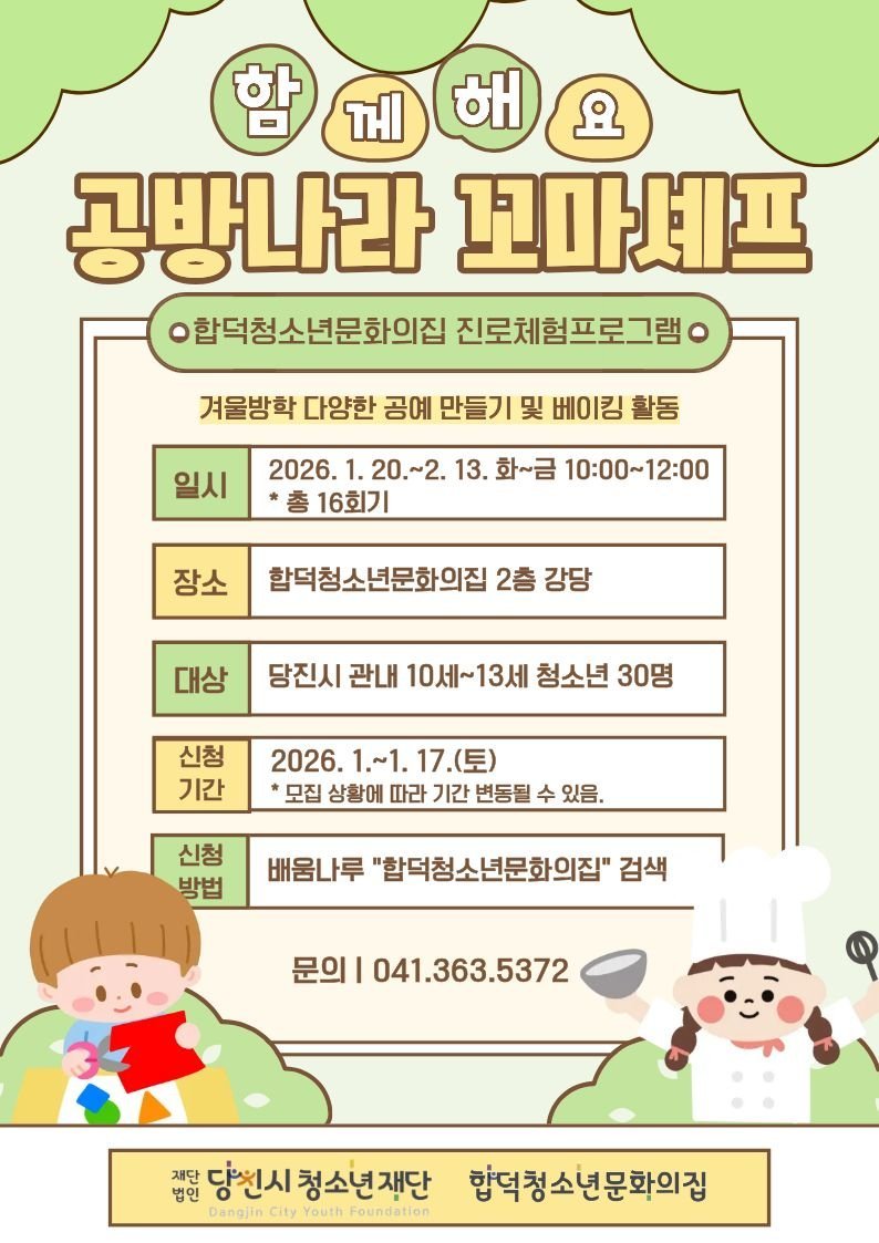 [세종타임즈] 합덕청소년문화의집은 방학 기간 중 공방나라 꼬마셰프 진로체험프로그램 2026년 1월 20일 화요일부터 2월 13일 금요일까지 화~금 10:00~12:00 총 16회기 다양한 공예 및 베이킹 체험을 희망하는 당진시 관내 청소년 초등학생 10세~13세 30명을 모집한다.