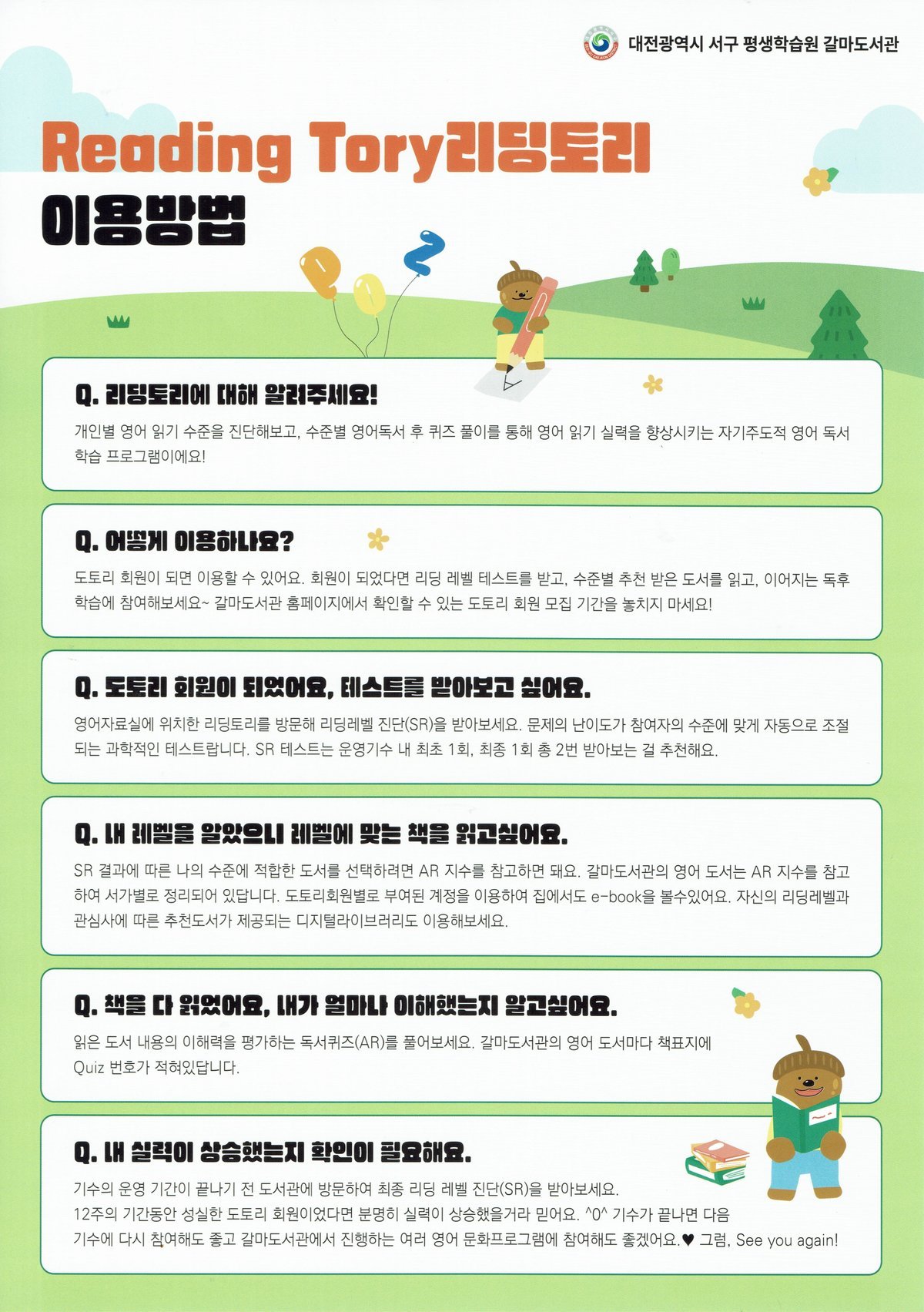 기타 자세한 사항은 갈마도서관 및 가수원도서관으로 문의하면 된다.