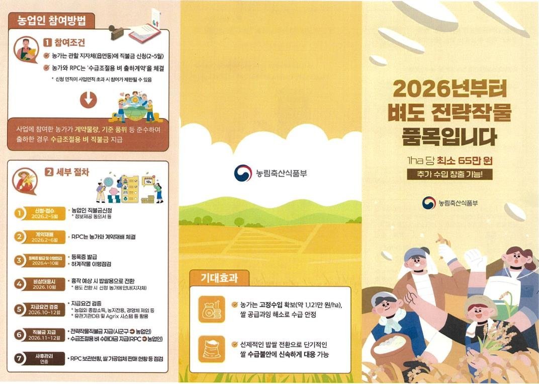 [세종타임즈] 홍성군은 국립농산물품질관리원 충남지원 홍성사무소에서 쌀 공급 과잉 문제를 해소하고 농가 소득을 안정적으로 지원하기 위해 2026년부터 수급조절용 벼 를 전략작물직불제 품목으로 새롭게 추가한다고 밝혔다.