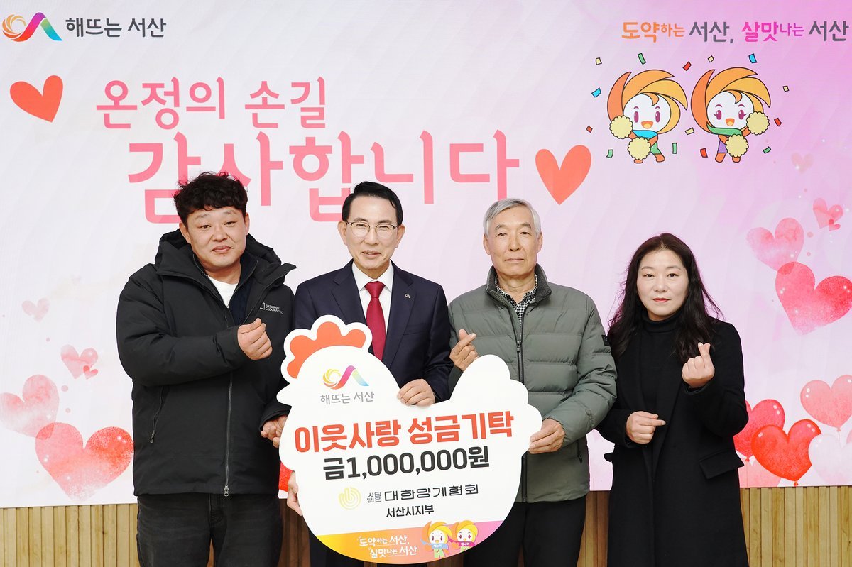 이완섭 서산시장은 “지역사회를 위한 따뜻한 나눔을 실천해 주신 대한양계협회에 깊이 감사드리며, 기탁해 주신 성금은 도움이 필요한 취약계층에게 소중히 전달하겠다”라고 말했다.