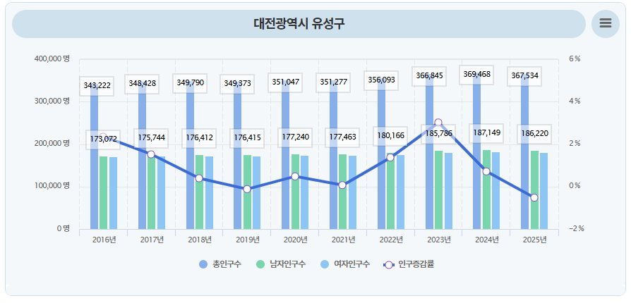 특히 유성구는 2016년 34만 3222명, 2017년 34만 8428명, 2018년 34만 9790명 등 매년 완만한 증가세를 보이다가 2023년 36만 6845명, 2024년 36만 9468명 등 37만에 육박하는 급증세를 나타냈다.