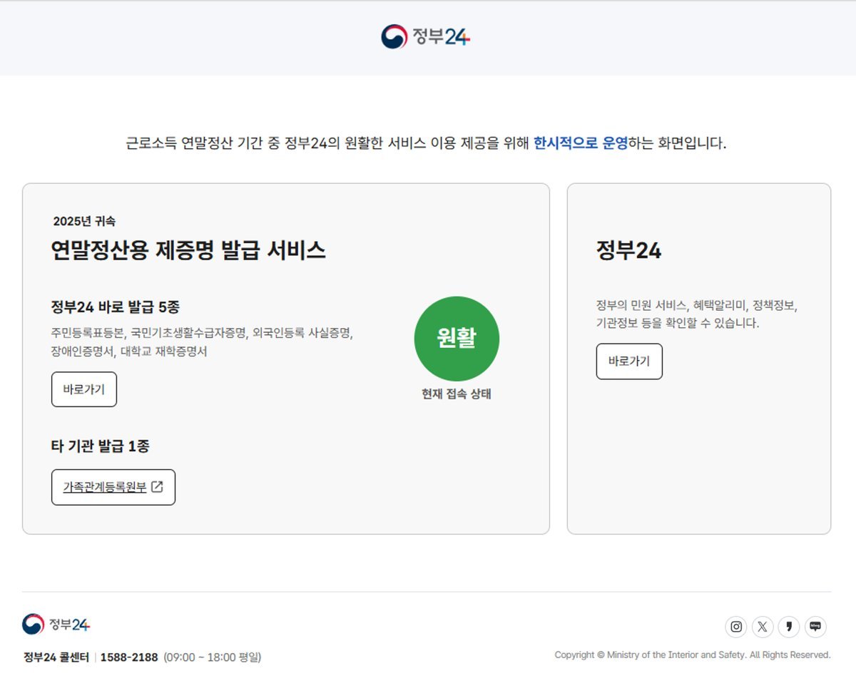 행정안전부는 연말정산 기간에 이용자 접속이 급증할 것에 대비해 전용창구를 운영하고, 접속 폭주 시 순번 대기 표시기능을 적용하는 등 이용자 불편을 최소화하여 정부24 운영의 안정성을 높인다는 계획이다.