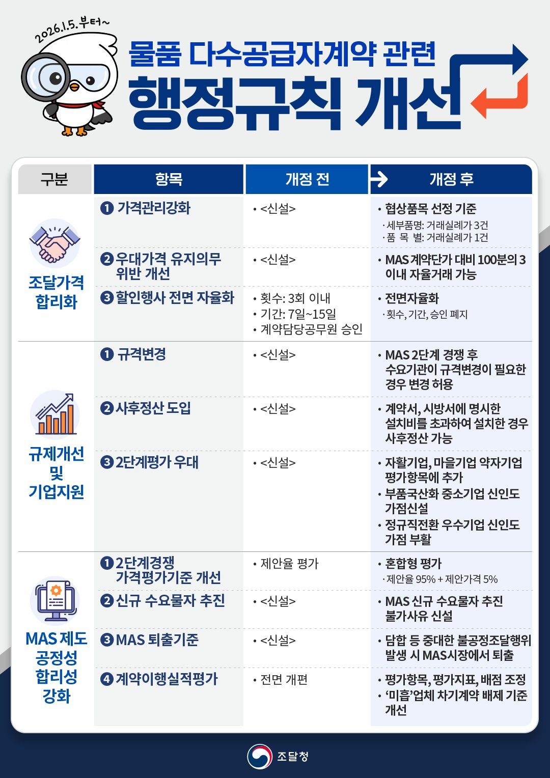[세종타임즈] 조달청은 조달 가격의 신뢰성을 높이고, 공공조달에 남아 있는 불합리한 규제를 혁파하기 위해 「물품 다수공급자계약 관련 행정규칙 2종*」을 개정하여 2026년 1월 5일부터 시행했다고 밝혔다.