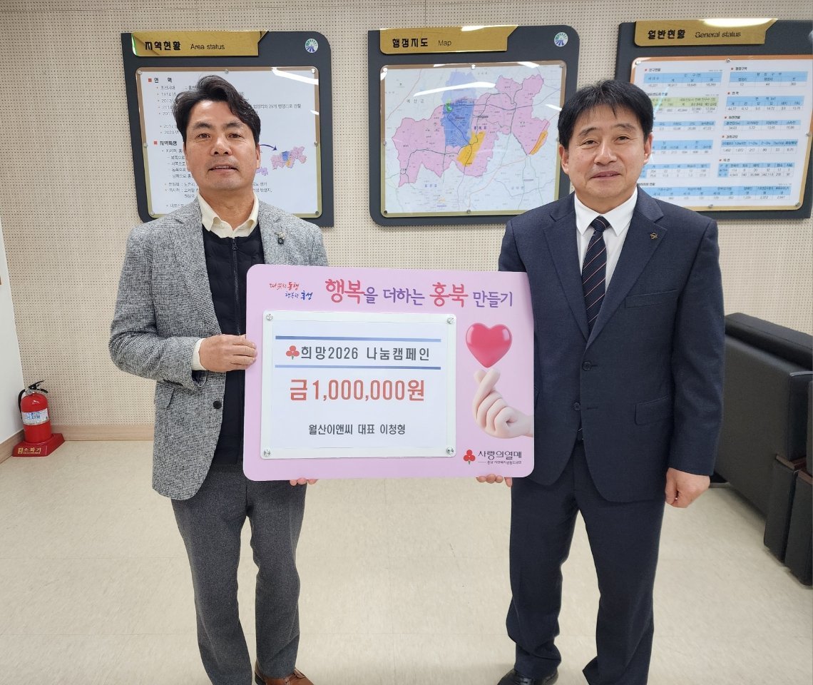 [세종타임즈] 홍성군은 ㈜월산이앤씨가 지난 13일, 지역사회 이웃돕기 실천의 일환으로 희망2026 나눔캠페인에 성금 100만 원을 기탁했다고 밝혔다.