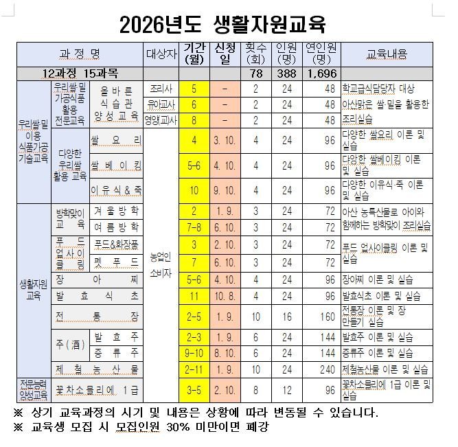 [세종타임즈] 아산시는 농촌자원의 가치 확산을 위해 ‘2026년 생활자원교육’수강생 모집을 1월부터 본격 시작했다고 밝혔다.