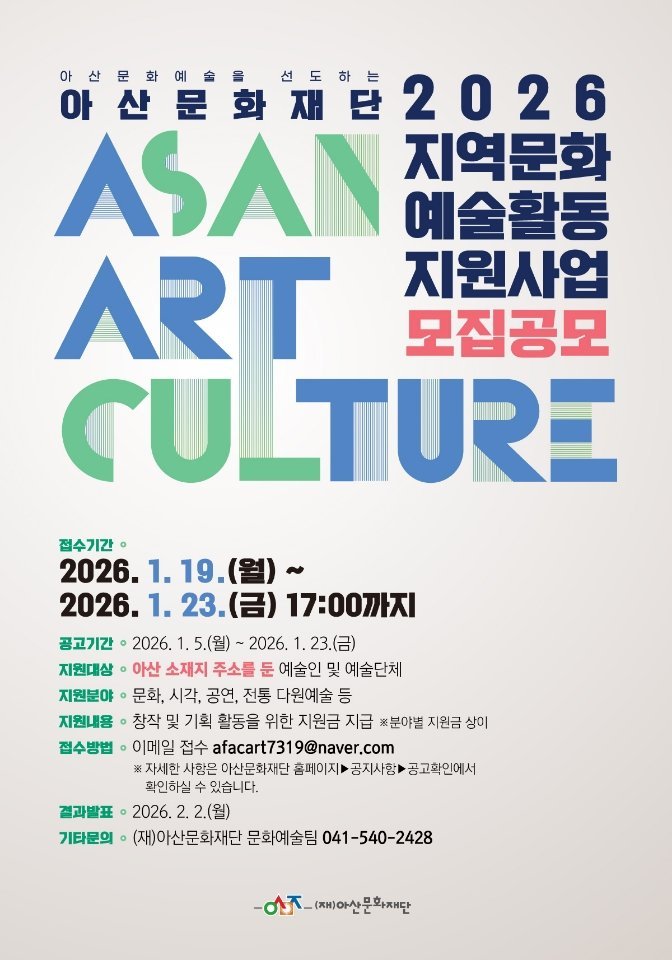 [세종타임즈] 아산문화재단은 지역 예술인의 안정적인 창작 환경을 조성하고 문화예술 생태계의 전문성을 강화하기 위해 '2026 지역문화예술 활동지원사업'공모를 시작한다.