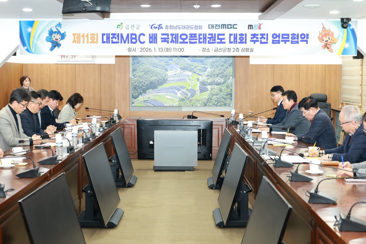 [세종타임즈] 금산군은 지난 13일 군청 2층 상황실에서 제11회 대전엠비씨배 국제오픈태권도대회 유치를 위해 대전엠비씨, 충남태권도협회, 엠비씨국제오픈태권도조직위원회와 업무협약을 체결했다.