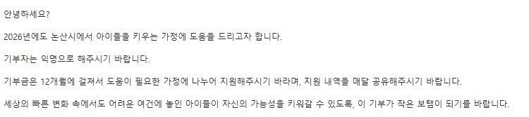 한편, 2020년부터 시작된 익명 기부자의 선행은 매년 논산시의 겨울을 녹이는 대표적인 미담으로 자리 잡았다. 논산시는 기부자의 익명성을 철저히 보장하는 한편, 이 같은 나눔의 가치가 지역사회 전반으로 확산될 수 있도록 지속적으로 노력하고 있다.
