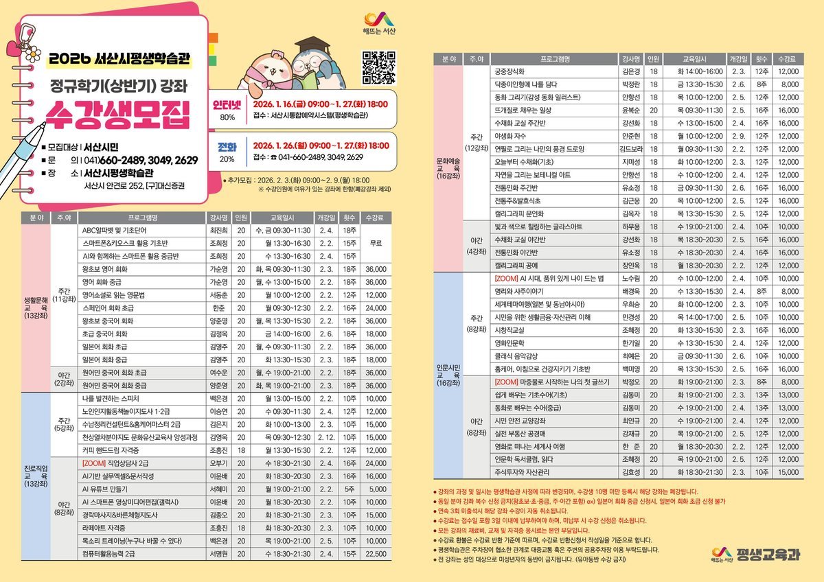 서산시민대학 상반기 정규학기는 서산시민이라면 누구나 참여할 수 있으며, 온라인과 전화로 신청할 수 있다.