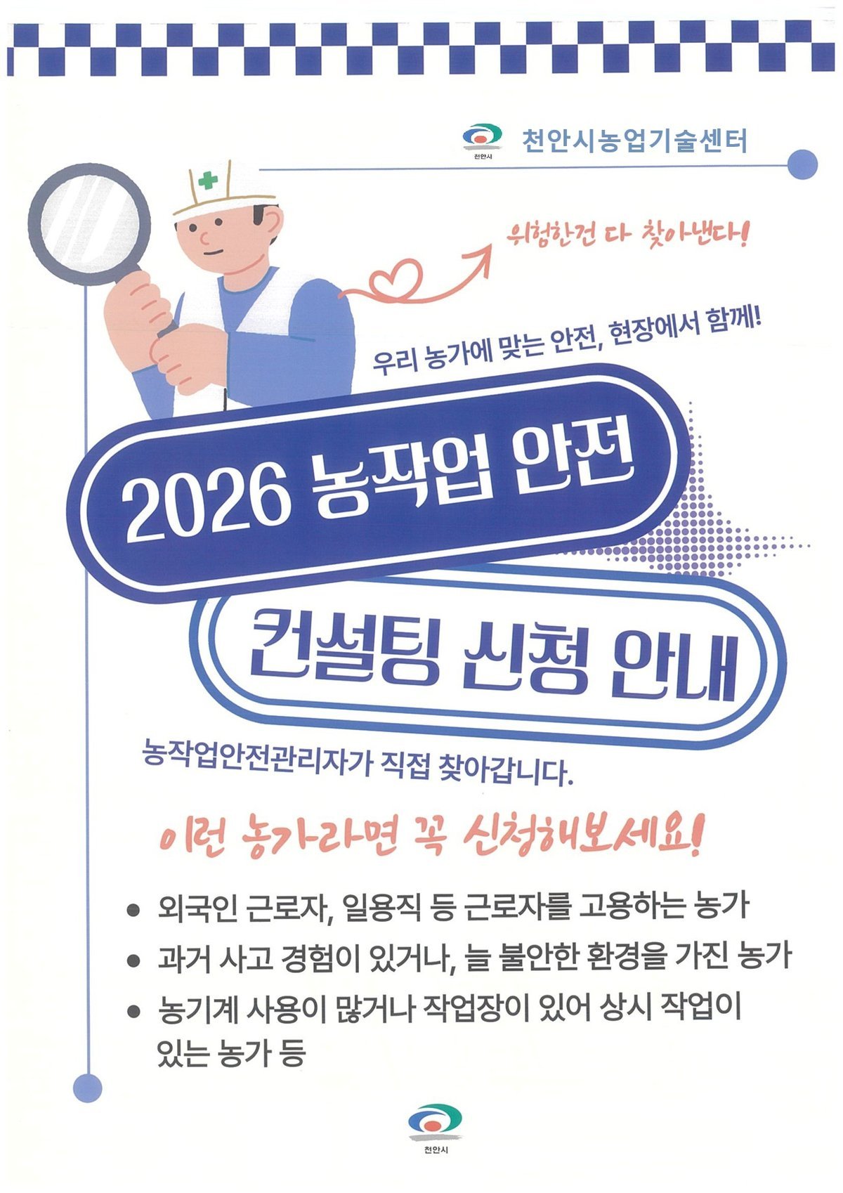 [세종타임즈] 천안시농업기술센터는 오는 3월까지 ‘농작업 안전컨설팅’참여 농가를 모집한다고 16일 밝혔다.