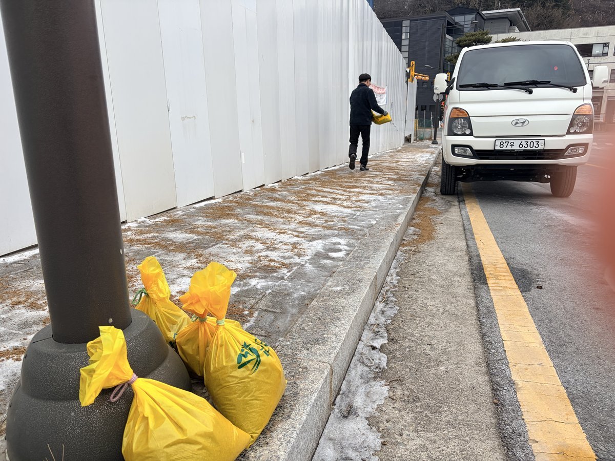 읍 직원들은 현장에서 직접 모래주머니와 염화칼슘을 운반해 꽁꽁 얼어붙은 노면에 살포하며 미끄럼 위험을 완화했다.