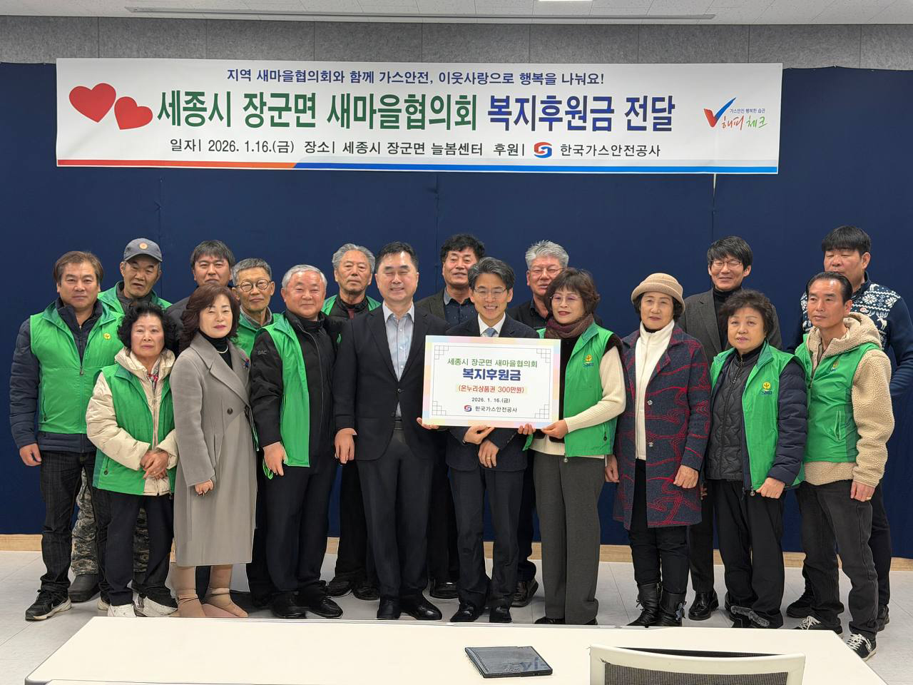 이날 행사에서는 한국가스안전공사가 세종시 장군면 새마을협의회에 복지후원금을 전달했다. 세종시새마을회는 그동안 지역 봉사와 생활환경 개선, 주민 지원과 나눔 활동을 꾸준히 이어오며 지역 공동체 활성화에 기여해 왔다.
