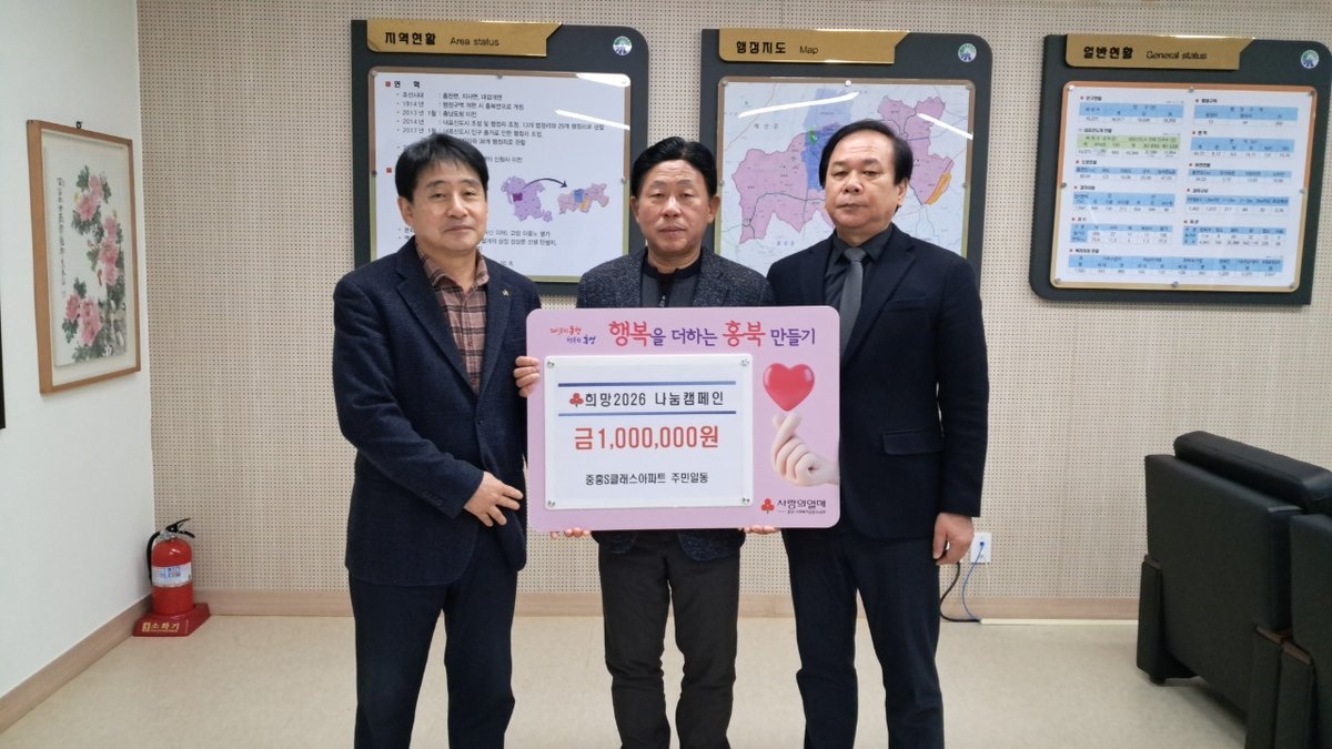 이날 전달식에는 중흥S클래스아파트 주민 일동을 대표해 노길호 이장과 정상진 관리소장이 참석했으며 김태기 홍북읍장이 성금을 전달받았다.