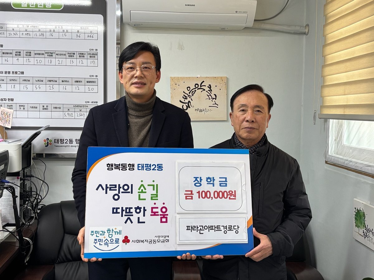 김상균 동장은 "파라곤경로당의 장학금 기탁은 태평2동이 추진 중인 '십시일반 프로젝트'의 좋은 본보기가 되고 있다"며 "앞으로도 주민 모두가 행복한 태평2동을 함께 만들어 나가겠다"고 답했다.