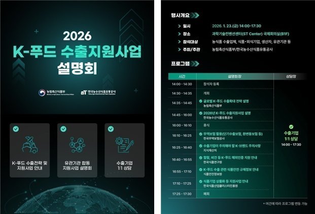 [세종타임즈] 농림축산식품부는 K-푸드의 글로벌 진출 확대를 위해 전년보다 900억원 증가한 7,070억원 규모의 2026년 K-푸드 수출지원사업 설명회를 1월 23일 서울 과학기술컨벤션센터에서 개최한다고 밝혔다.