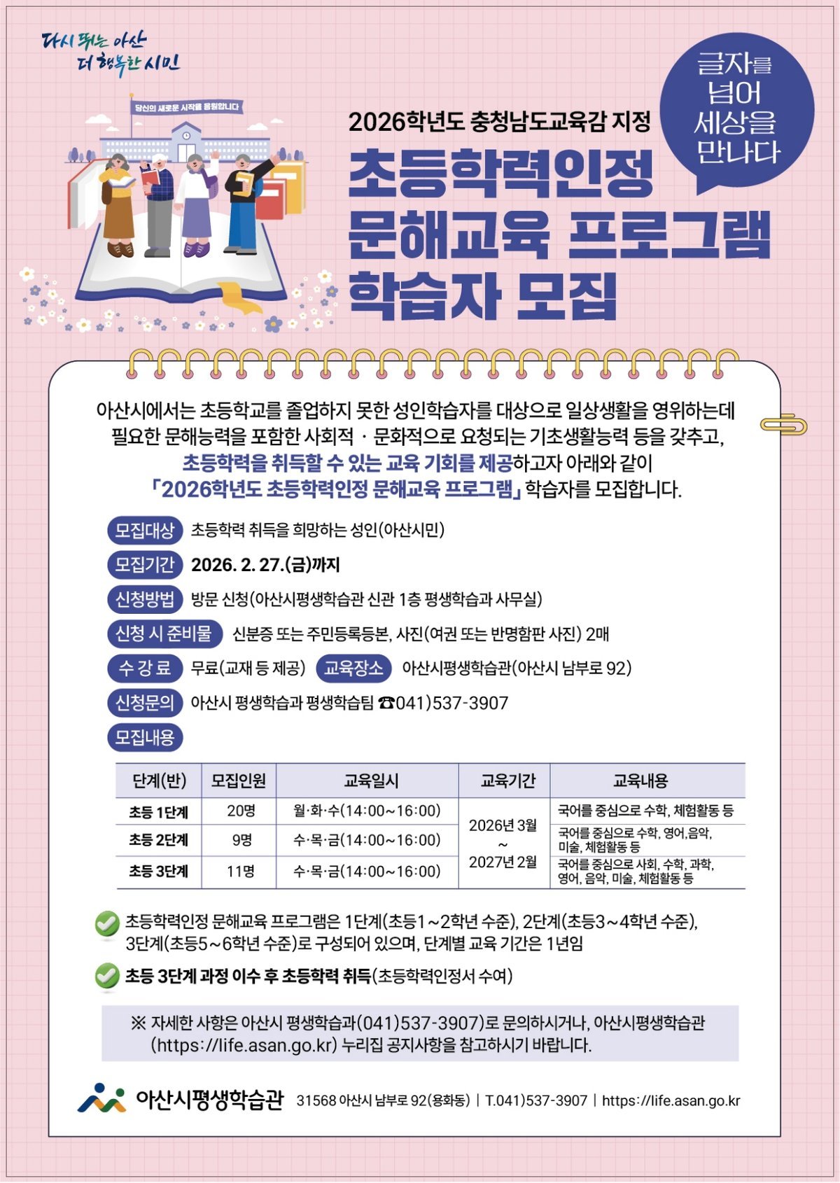 [세종타임즈] 아산시는 초등학교 과정을 마치지 못한 성인을 대상으로 생활 전반에 필요한 기초 문해 능력과 사회·문화적 적응 역량을 기를 수 있도록 ‘2026학년도 초등학력인정 문해교육 프로그램’을 운영하고 이에 참여할 학습자를 모집한다.