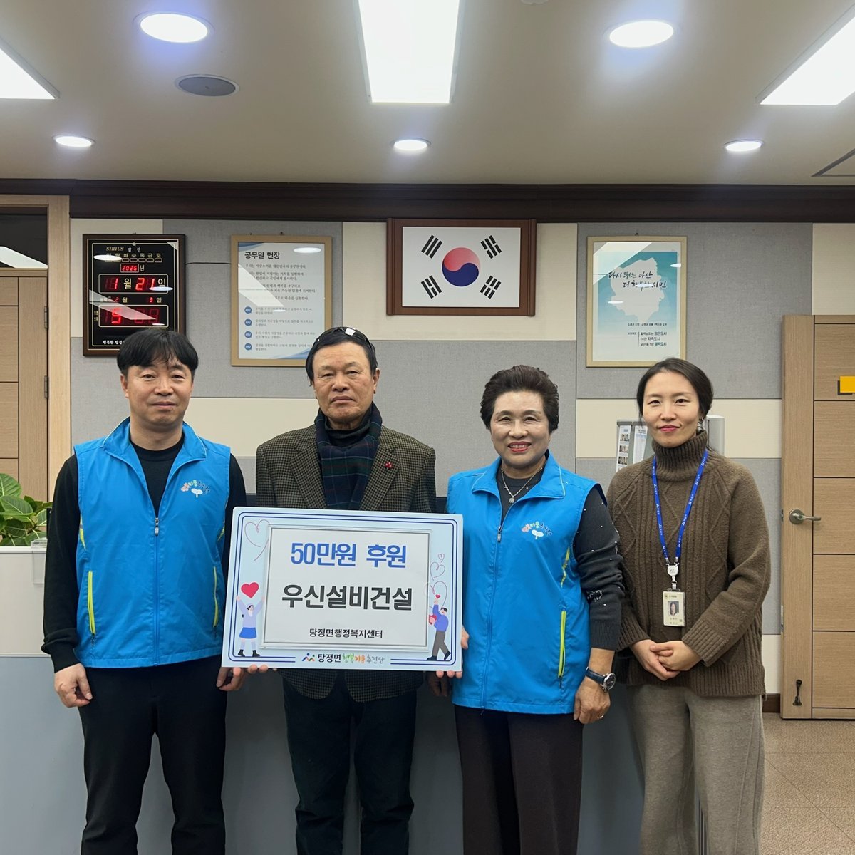 [세종타임즈] 우신설비건설㈜은 지난 21일 탕정면 행복키움추진단에 후원금 50만원을 전달했다.