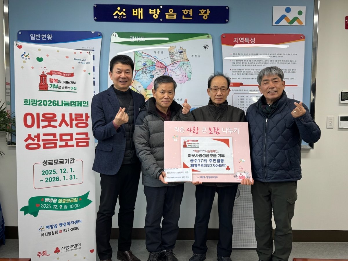 강한용 배방읍장은 “나눔을 실천해 주신 공수17리 주민 여러분께 감사드린다”며 “기탁된 성금은 도움이 필요한 이웃들에게 투명하고 공정하게 전달하겠다”고 밝혔다.