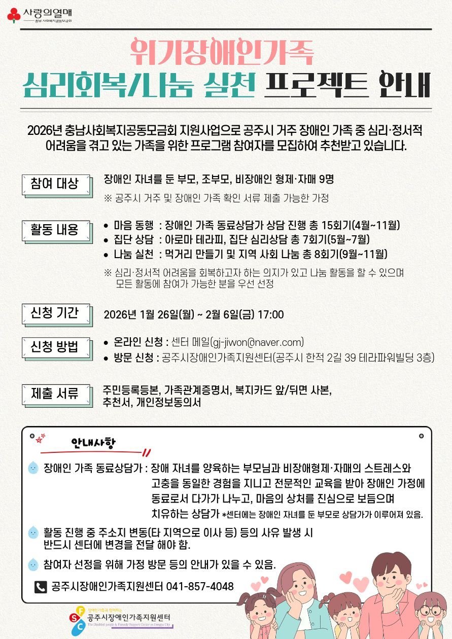 [세종타임즈] 공주시 장애인가족지원센터는 2026년 충남사회복지공동모금회 지원을 받아 ‘위기 장애인가족 심리회복 및 나눔 실천 프로젝트’참여자를 모집한다고 26일 밝혔다.