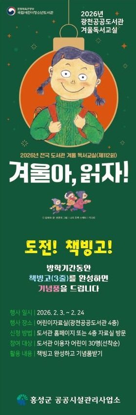 [세종타임즈] 홍성군 광천도서관에서는 다음달 3일부터 24일까지 어린이 이용자들을 대상으로 한 ‘겨울방학 독서교실’을 운영한다고 밝혔다.