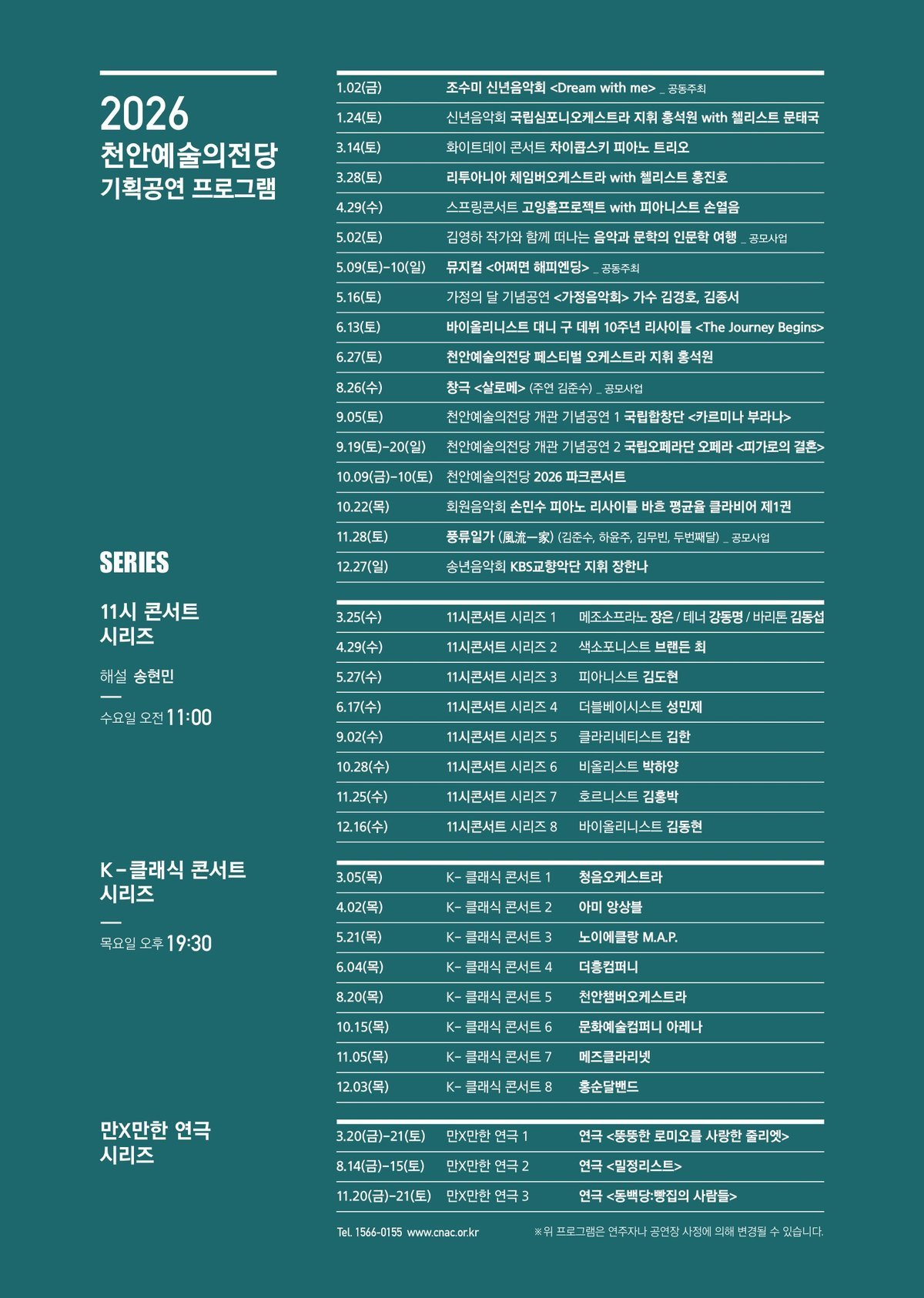 2026년 시즌의 시작은 최근 열린 천안예술의전당 신년음악회에서 국립심포니오케스트라와 홍석원 지휘 아래 첼리스트 문태국이 웅장한 무대로 알렸으며 이후 △3월, 화이트데이 콘서트 ‘차이콥스키 피아노 트리오’·리투아니아 체임버오케스트라 with 첼리스트 홍진호 △4월, 스프링콘서트 ‘고잉홈프로젝트 with 피아니스트 손열음’△5월, 뮤지컬 ‘어쩌면 해피엔딩’△6월, 바이올리니스트 대니 구 데뷔 10주년 리사이틀 ‘The Journey Begins’·천안예술의전당 페스티벌 오케스트라 with 지휘 홍석원이 이어진다.