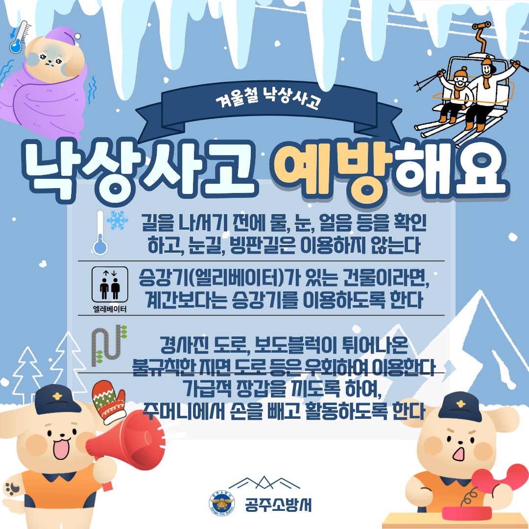 공주소방서가 구조활동 통계를 분석한 결과, 2023~2024년 겨울철(11월~다음 해 2월) 낙상사고는 총 276건으로 이 가운데 빙판길 낙상사고는 7건으로 집계됐다.
