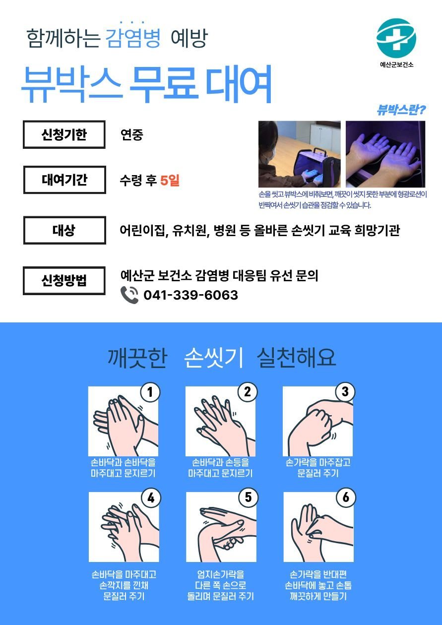 [세종타임즈] 예산군보건소는 지역 내 유치원과 어린이집, 초·중·고등학교, 병원 등을 대상으로 감염성 질환을 차단하고 올바른 손 씻기 습관 형성을 돕기 위해 ‘손 씻기 체험기기 무료 대여 사업’을 실시한다.