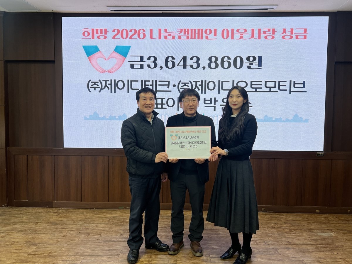[세종타임즈] 아산시에 소재한 ㈜제이디테크·㈜제이디오토모티브는 지난 28일 둔포면 행정복지센터를 방문해 ‘희망2026나눔캠페인’이웃돕기 성금 364만 3860원을 전달했다.
