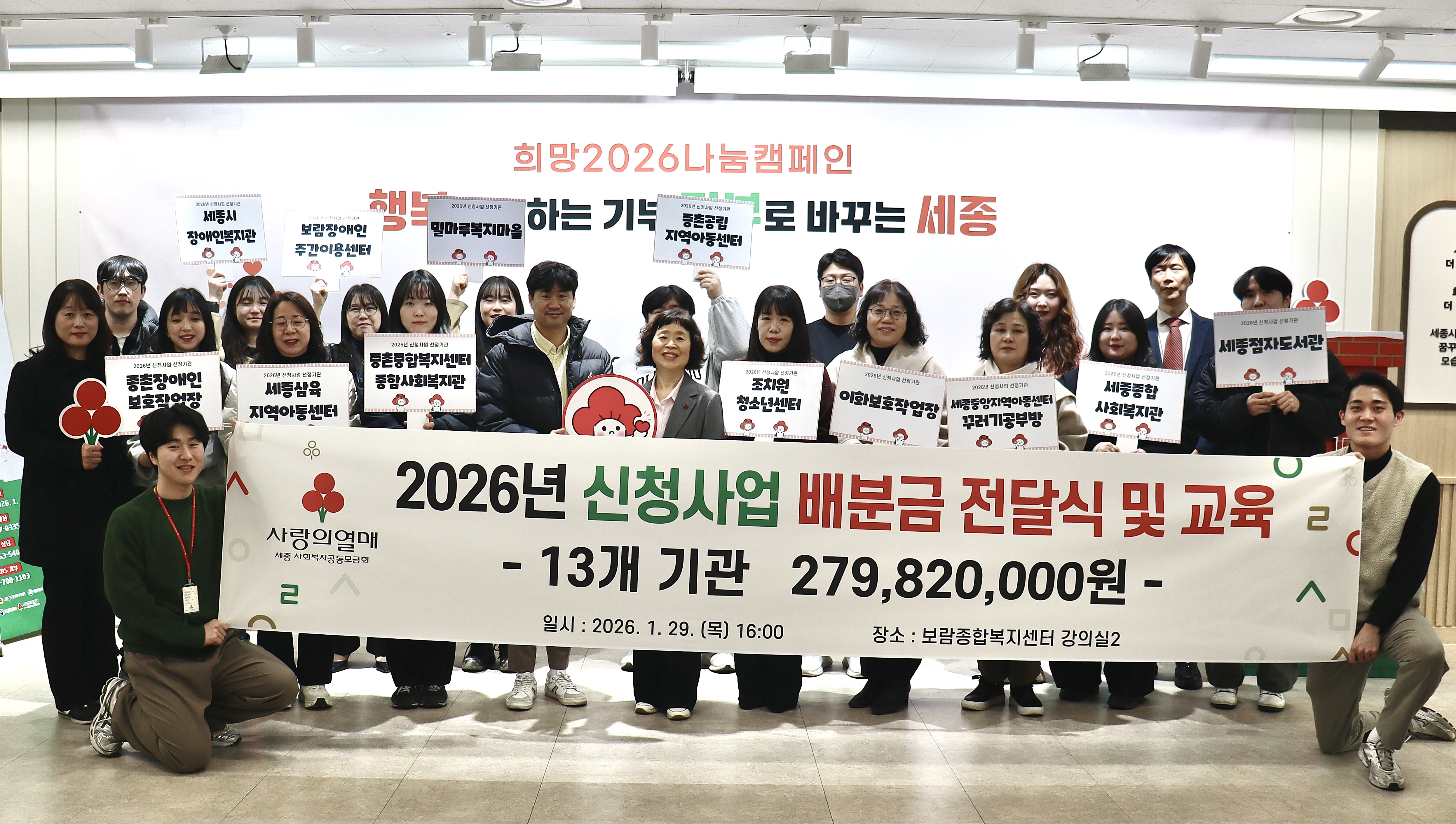 [세종타임즈] 세종사회복지공동모금회(세종사랑의열매·회장 박상혁)는 29일 오후 4시 보람종합복지센터 강의실에서 2026년 신청사업 배분금 전달식을 열고, 관내 사회복지기관 13곳에 총 2억 8천여만 원의 배분금을 전달했다.