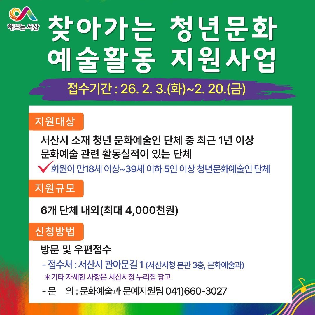 [세종타임즈] 충남 서산시는 청년 문화예술 활성화를 위해 오는 2월 20일까지 ‘2026년 찾아가는 청년문화 예술활동 지원사업’참여단체 6팀을 모집한다고 밝혔다.