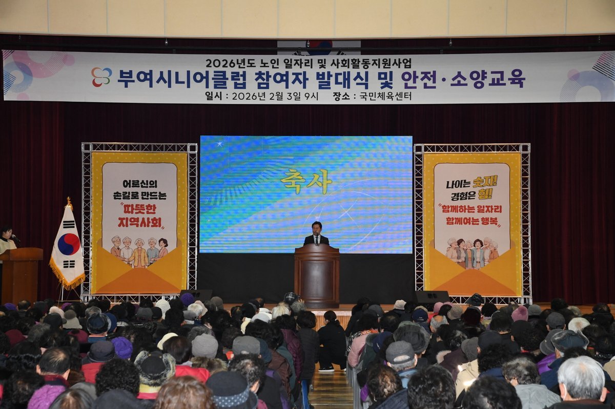 [세종타임즈] 부여시니어클럽은 지난 3일 부여국민체육센터에서 노인일자리 및 사회활동 지원사업 참여 어르신 약 2040명을 모시고 2026년 노인일자리 발대식 및 안전교육을 실시했다.